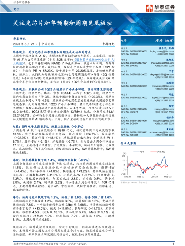 【华泰证券】【20230521】电子行业专题研究:关注光芯片加单预期和周期见底板块-36页 行业研究