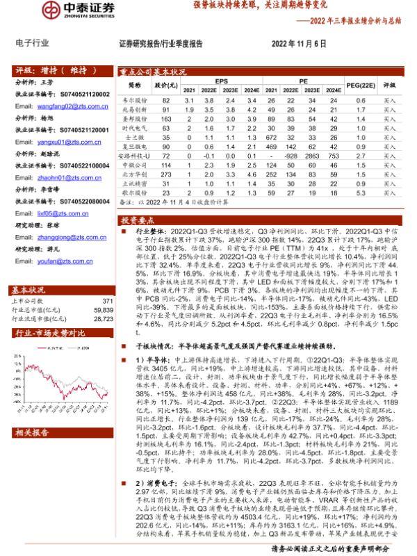 【中泰证券】【20221106】电子行业2022年三季报业绩分析与总结:强势板块持续亮眼,关注周期趋势变化-38页 行业研究