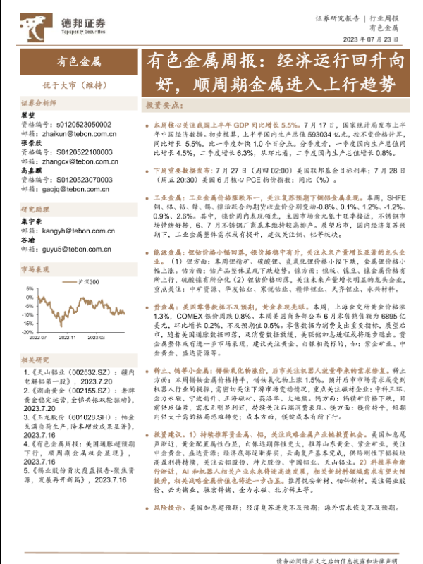 【德邦证券】【20230723】有色金属周报:经济运行回升向好,顺周期金属进入上行趋势-25页 行业研究