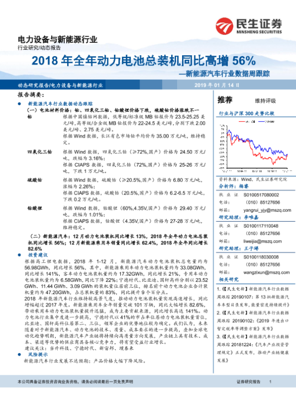 【民生证券】【20190114】20190114-民生证券-新能源汽车行业数据周跟踪:2018年全年动力电池总装机同比高增56%-11页 行业研究