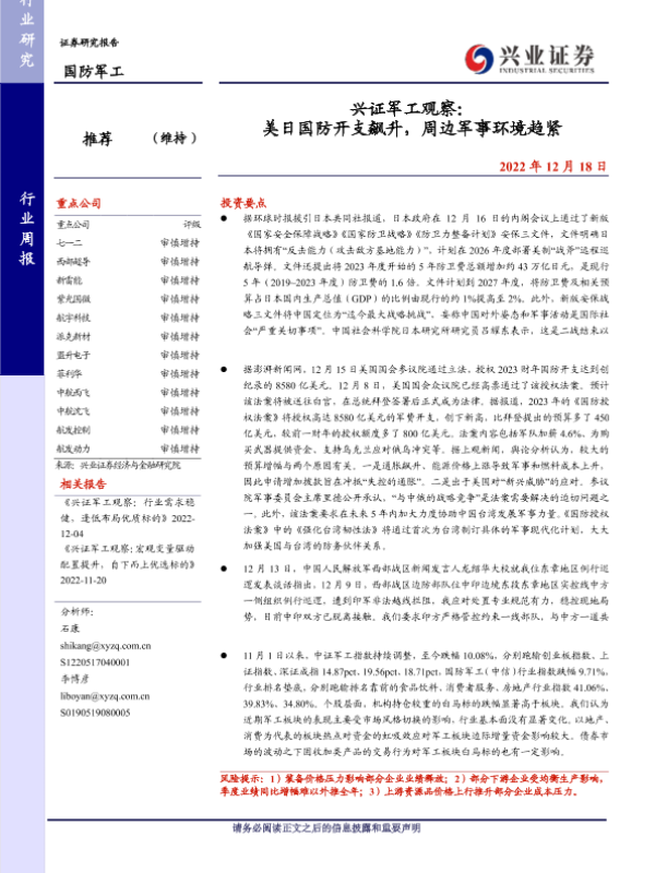 【兴业证券】【20221218】兴证军工观察:美日国防开支飙升,周边军事环境趋紧-21页 行业研究