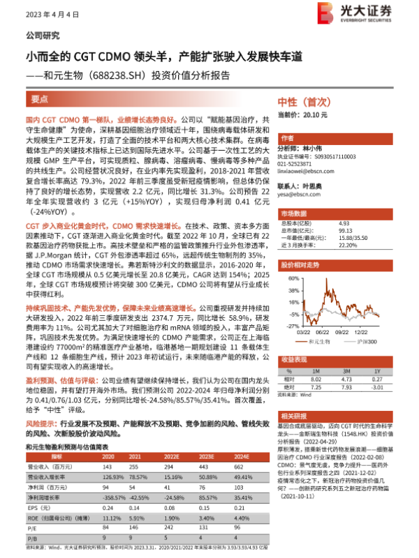 【光大证券】【20230406】和元生物(688238)投资价值分析报告:小而全的CGT CDMO领头羊,产能扩张驶入发展快车道-27页 行业研究