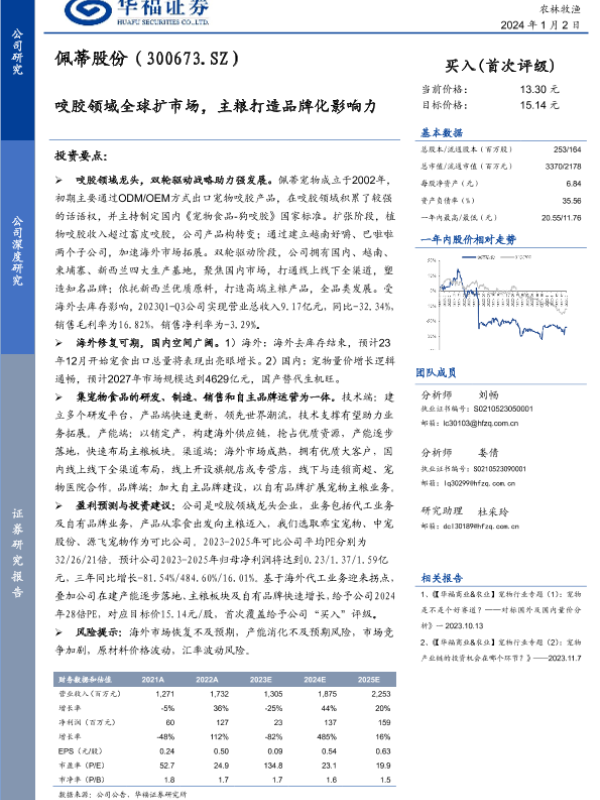 【华福证券】【20240102】佩蒂股份(300673.SZ)咬胶领域全球扩市场,主粮打造品牌化影响力-27页 行业研究