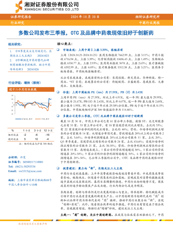 【湘财证券】【20241030】中药行业周报:多数公司发布三季报,OTC及品牌中药表现依旧好于创新药-12页 行业研究
