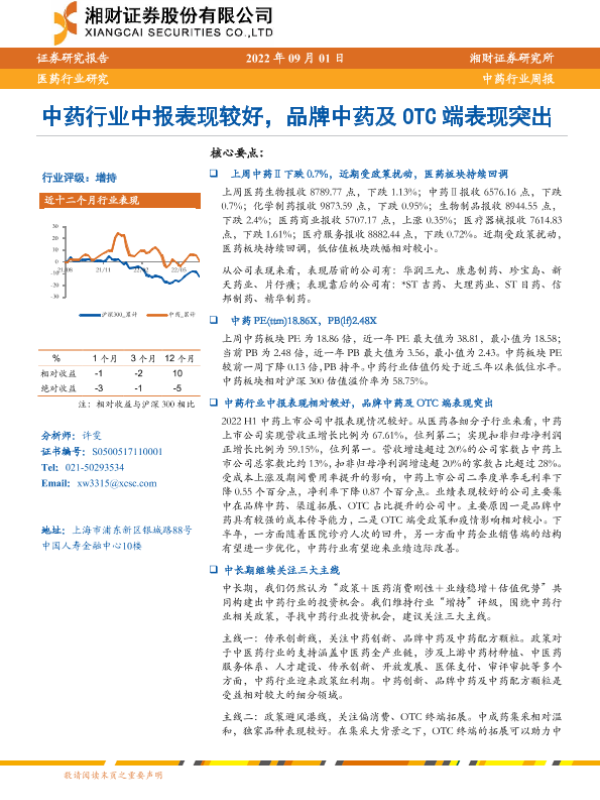 【湘财证券】【20220901】中药行业周报:中药行业中报表现较好,品牌中药及OTC端表现突出-12页 行业研究
