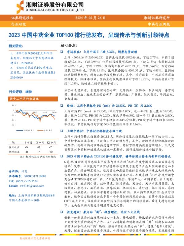 【湘财证券】【20240626】2023中国中药企业TOP100排行榜发布,呈现传承与创新引领特点-12页 行业研究