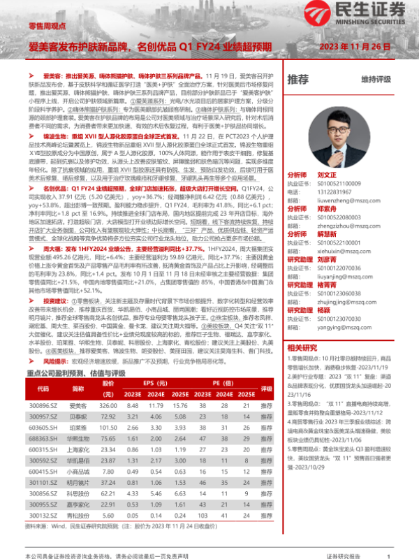 【民生证券】【20231126】零售周观点:爱美客发布护肤新品牌,名创优品Q1 FY24业绩超预期-20页 行业研究