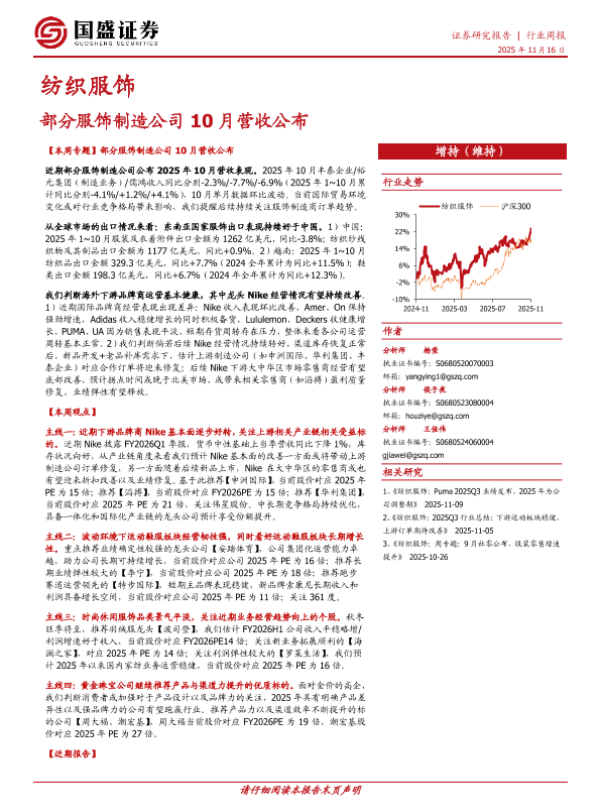 【国盛证券】【202511】部分服饰制造公司10月营收公布-14页 证券期货研究报告