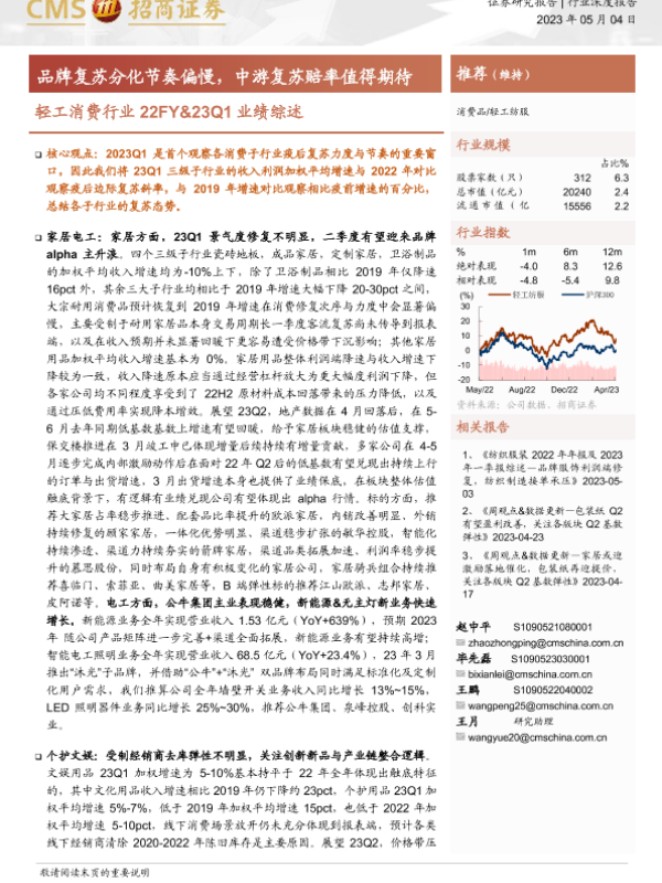 【海通证券】【20230504】轻工消费行业22FY&23Q1业绩综述:品牌复苏分化节奏偏慢,中游复苏赔率值得期待-42页 行业研究