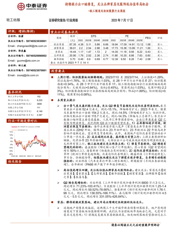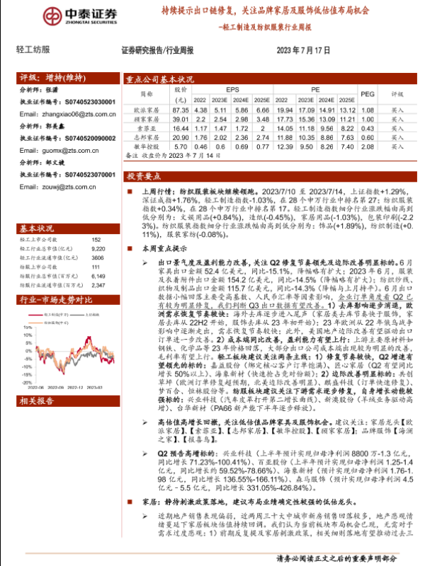 【中泰证券】【20230717】轻工制造及纺织服装行业周报:持续提示出口链修复,关注品牌家居及服饰低估值布局机会-21页 行业研究