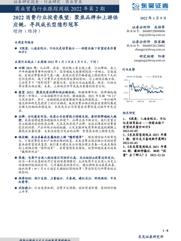 【东吴证券】【20220109】2022消费行业投资展望:聚焦品牌和上游供应链,寻找成长型隐形冠军-8页 行业研究