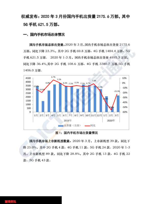 【中国信通院】【20200414】2020年3月份国内手机出货量2175.6万部,其中5G手机621.5万部-3页 市场调研