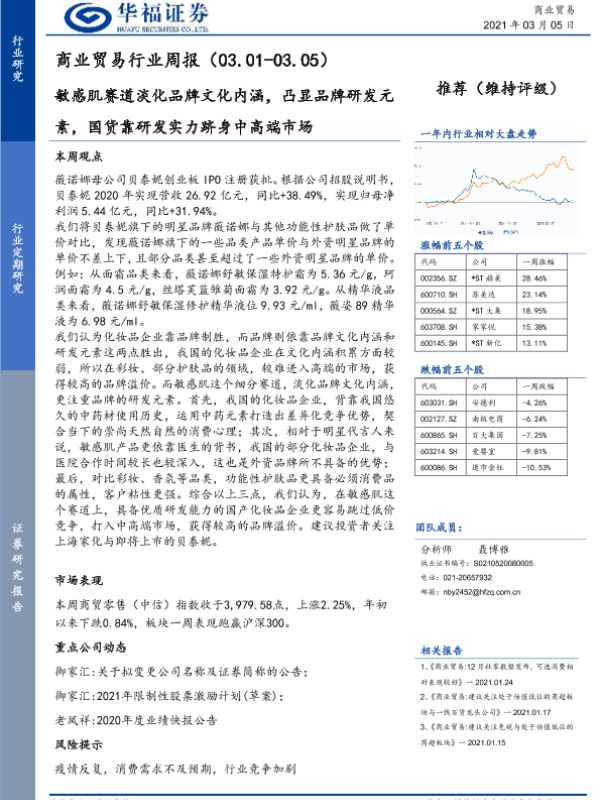 【华福证券】【20210305】商业贸易行业周报:敏感肌赛道淡化品牌文化内涵,凸显品牌研发元素,国货靠研发实力跻身中高端市场-8页 行业研究