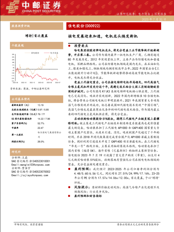 【中邮证券】【20230731】20230731-中邮证券-佳电股份-000922.SZ-核电发展迎来加速,电机龙头焕发新机-25页 行业研究