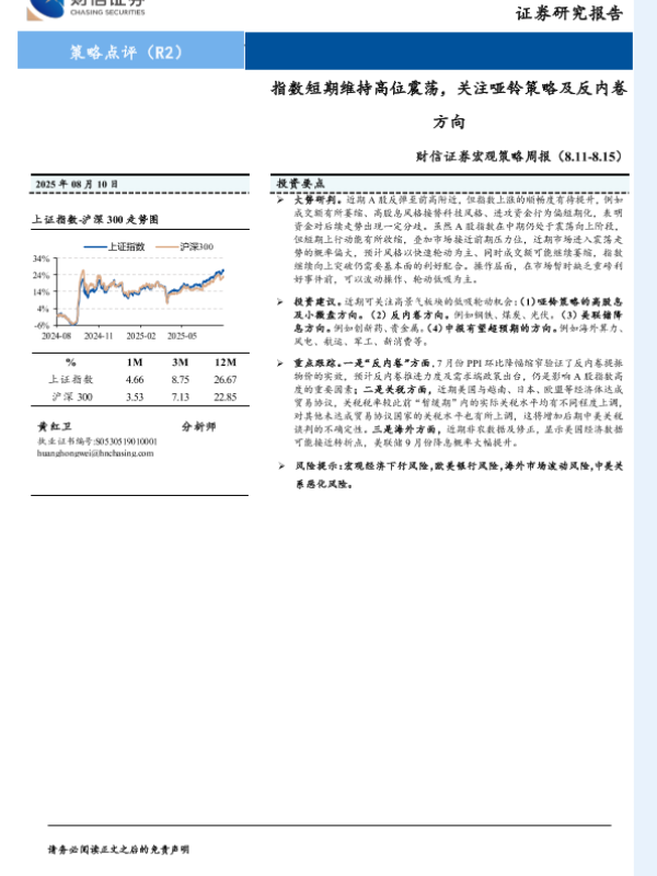 【财信证券】【20250810】宏观策略周报:指数短期维持高位震荡,关注哑铃策略及反内卷方向-10页 宏观策略