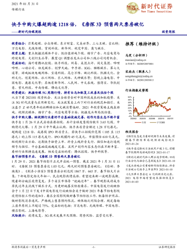 【新时代证券】【20210131】新时代传媒周报:快手申购火爆超购逾1218倍,《唐探 3》预售两天票房破亿-32页 行业研究