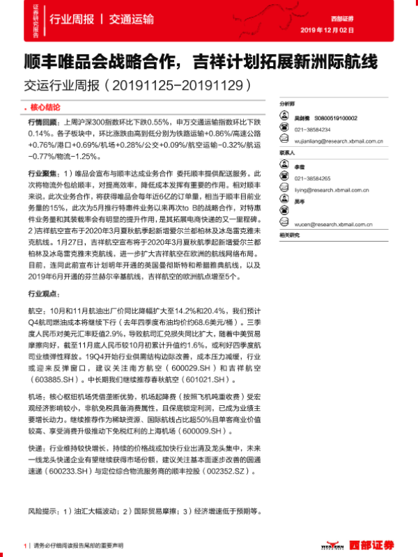 【西部证券】【20191202】交运行业周报:顺丰唯品会战略合作,吉祥计划拓展新洲际航线-15页 行业研究