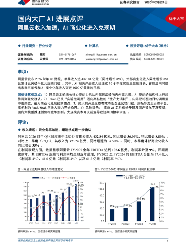 【国信证券】【202603】国内大厂AI进展点评-阿里云收入加速,AI商业化进入兑现期-7页 证券期货研究报告
