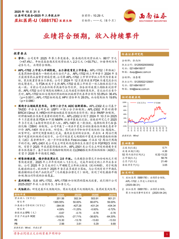 【西南证券】【202510】亚虹医药-U(688176):业绩符合预期,收入持续攀升-6页 证券期货研究报告