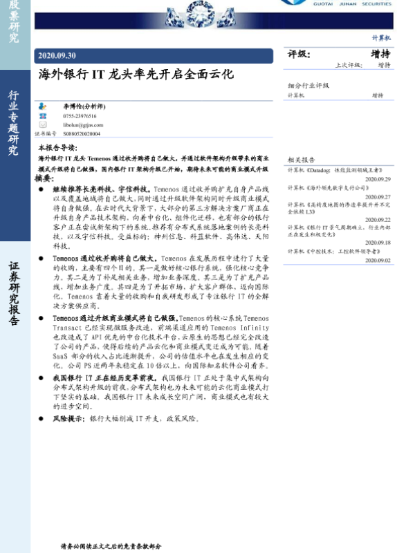【国泰君安证券】【20200930】海外银行IT龙头率先开启全面云化-17页 行业研究
