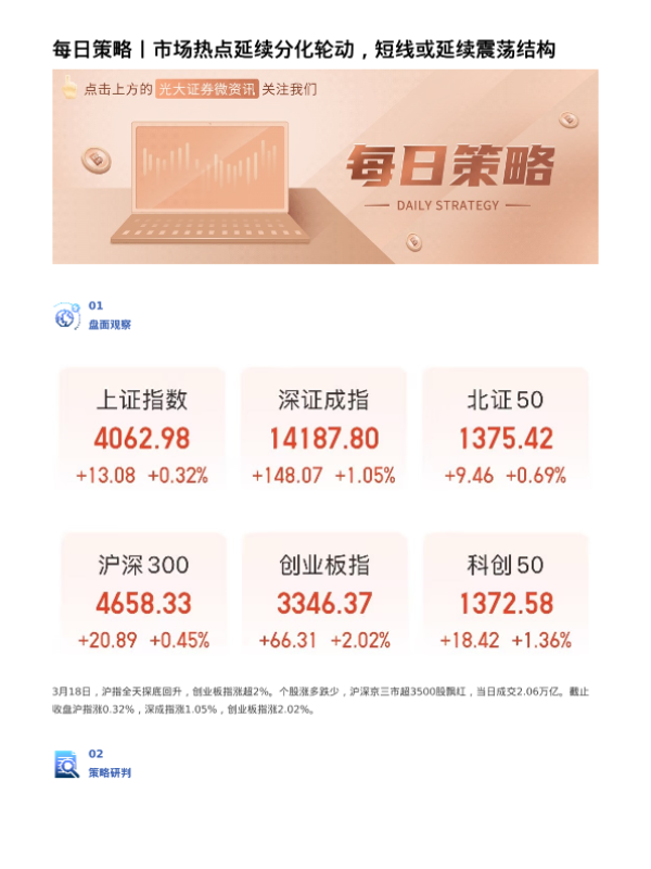 【光大证券】【202303】每日策略丨市场热点延续分化轮动,短线或延续震荡结构-3页 证券期货研究报告