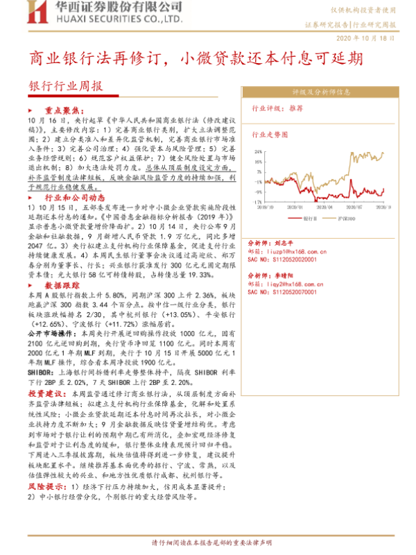 【华西证券】【20201018】银行行业周报:商业银行法再修订,小微贷款还本付息可延期-9页 行业研究
