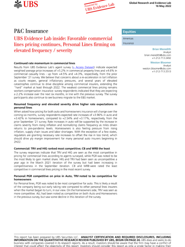 【瑞银】【20220516】瑞银-美股保险行业-瑞银证据实验室内部报告:有利的商业险定价持续,个人险因频率严重程度升高而坚挺-33页 行业研究