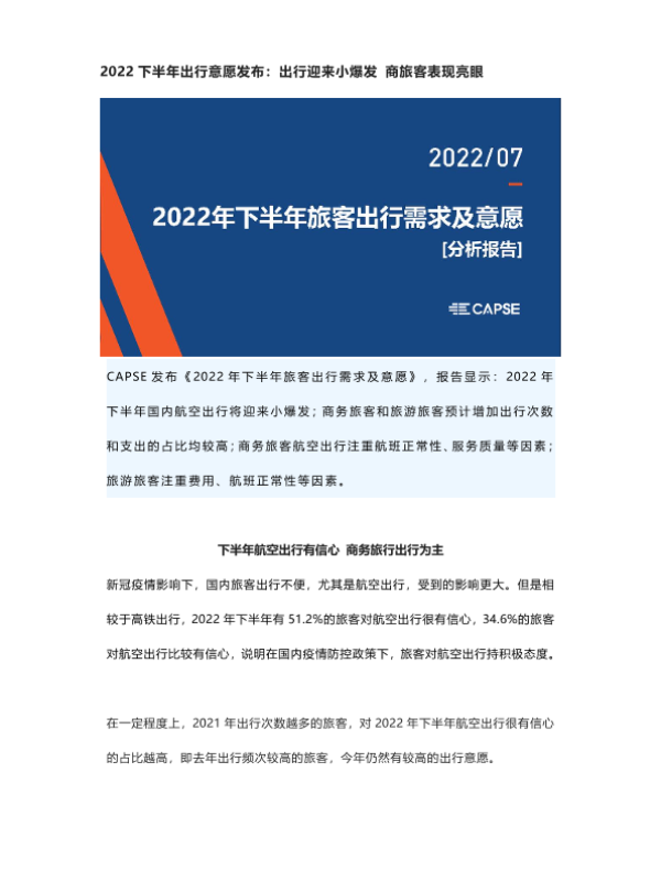 【CAPSE】【20220731】2022下半年出行意愿发布:出行迎来小爆发 商旅客表现亮眼-6页 市场调研