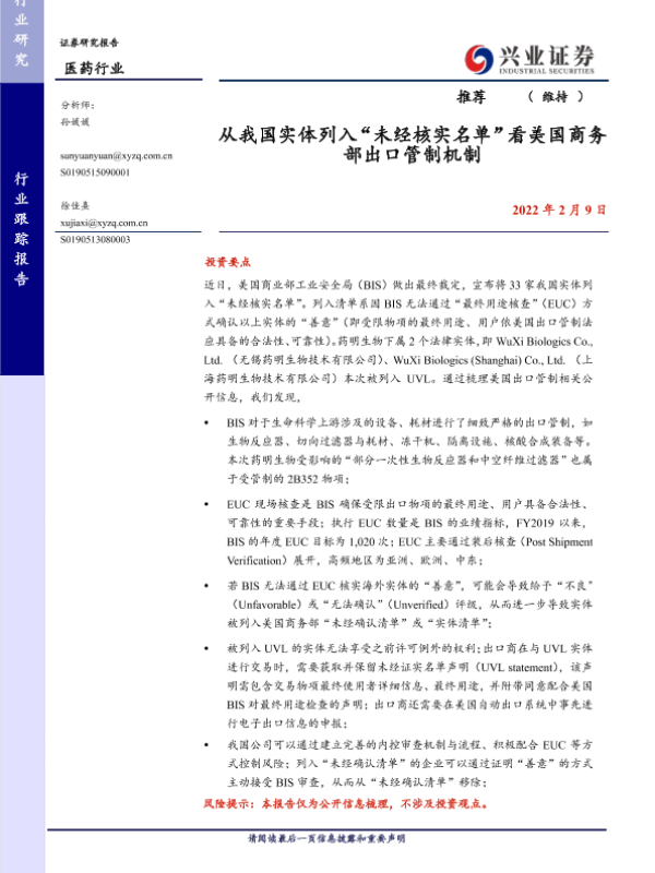 【兴业证券】【20220209】从我国实体列入“未经核实名单”看美国商务部出口管制机制-12页 行业研究