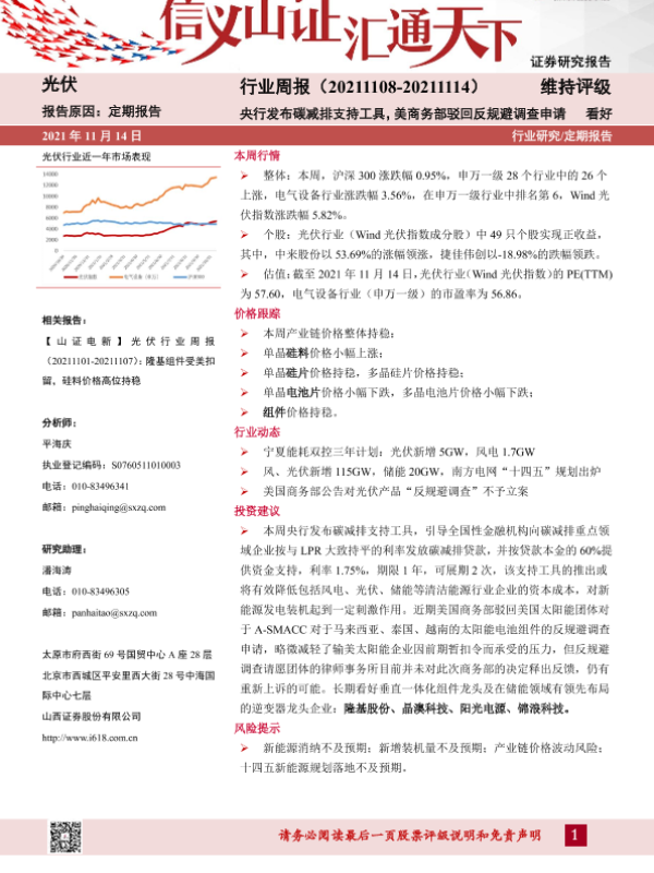 【山西证券】【20211114】光伏行业周报:央行发布碳减排支持工具,美商务部驳回反规避调查申请-11页 行业研究