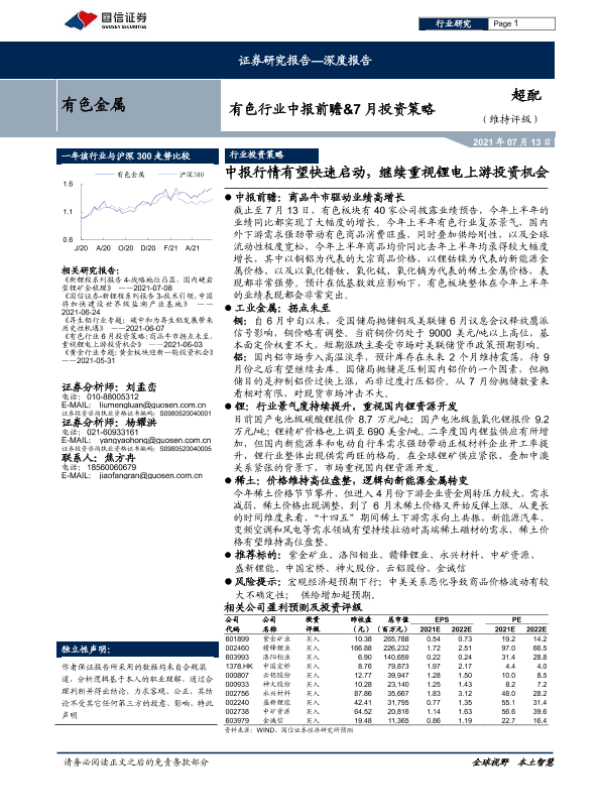 【国信证券】【20210713】有色行业中报前瞻&7月投资策略:中报行情有望快速启动,继续重视锂电上游投资机会-26页 行业研究