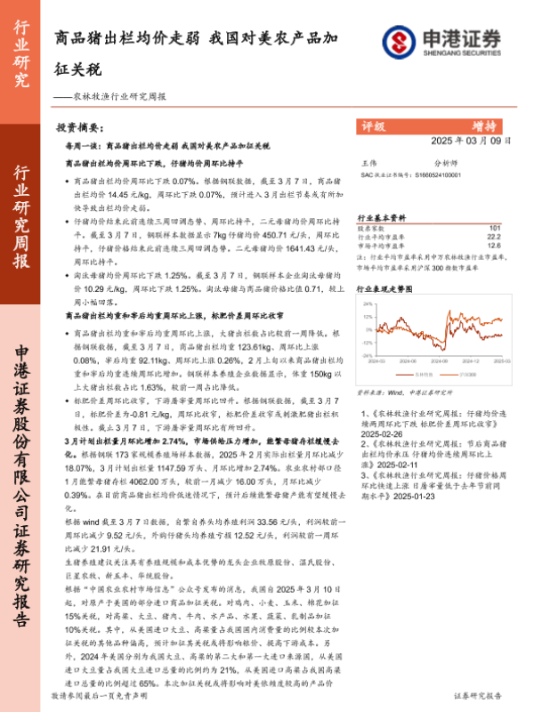 【申港证券】【20250309】20250309-申港证券-农林牧渔行业研究周报:商品猪出栏均价走弱,我国对美农产品加征关税-10页 行业研究