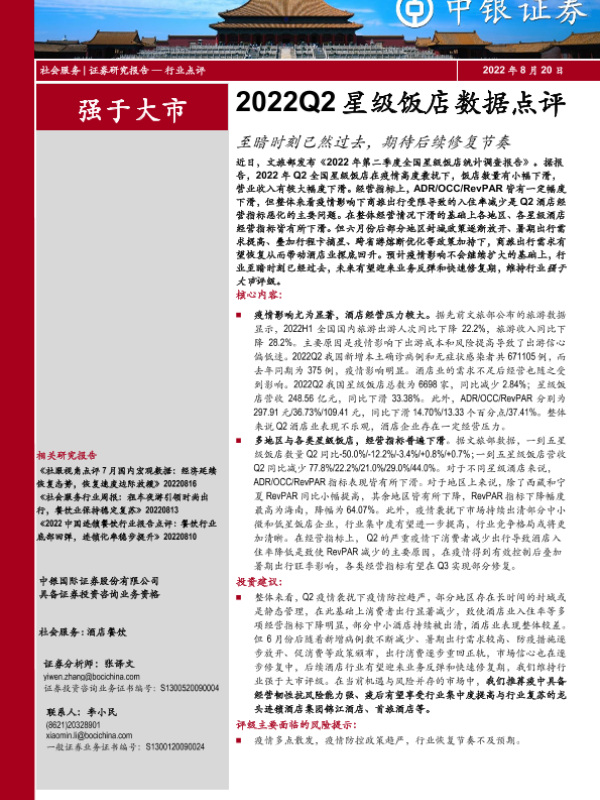 【中银证券】【20220820】2022Q2星级饭店数据点评:至暗时刻已然过去,期待后续修复节奏-8页 行业研究