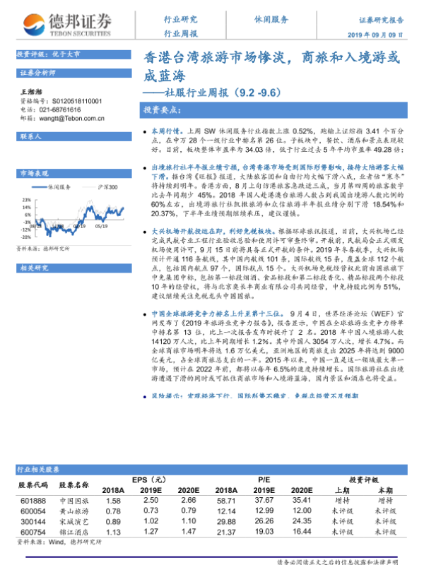 【德邦证券】【20190909】社服行业周报:香港台湾旅游市场惨淡,商旅和入境游或成蓝海-8页 行业研究
