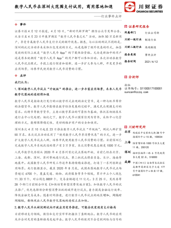 【川财证券】【20210412】高端制造行业事件点评:数字人民币在深圳大范围支付试用,商用落地加速-3页 证券期货研究报告