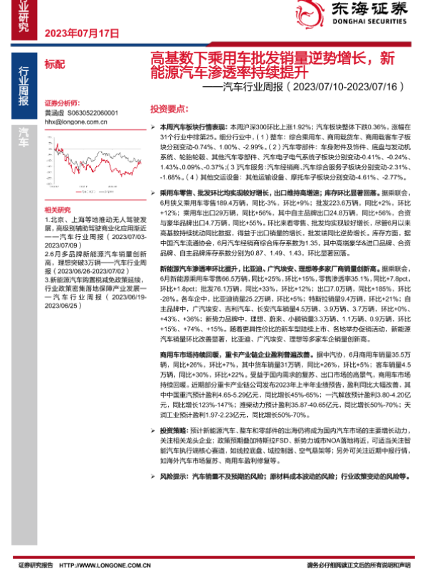 【东海证券】【20230717】高基数下乘用车批发销量逆势增长,新能源汽车渗透率持续提升-16页 行业研究