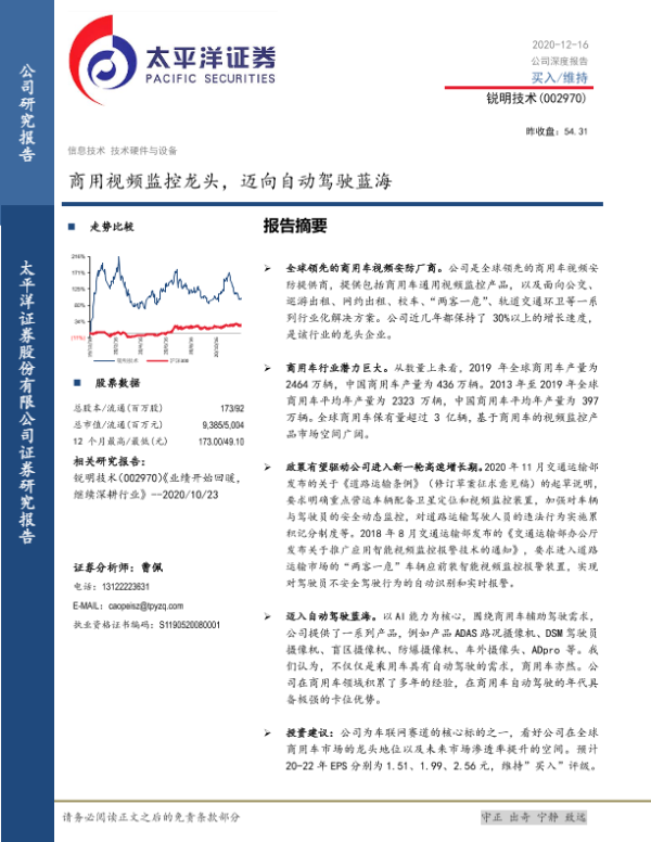 【太平洋证券】【20201216】商用视频监控龙头,迈向自动驾驶蓝海-33页 行业研究