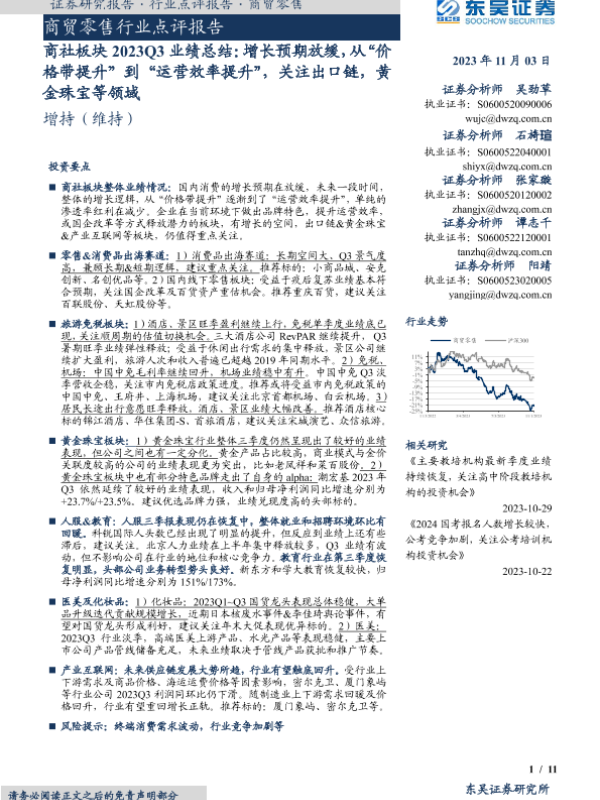 【东吴证券】【20231103】商社板块2023Q3业绩总结:增长预期放缓,从“价格带提升”到“运营效率提升”,关注出口链,黄金珠宝等领域-11页 行业研究