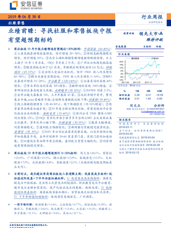 【安信证券】【20190630】业绩前瞻:寻找社服和零售板块中报有望超预期标的-20页 行业研究