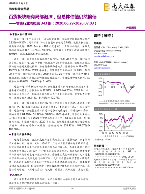 【光大证券】【20200704】零售行业周报第343期:百货板块略有局部泡沫,但总体估值仍然偏低-10页 行业研究