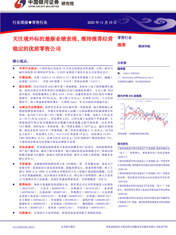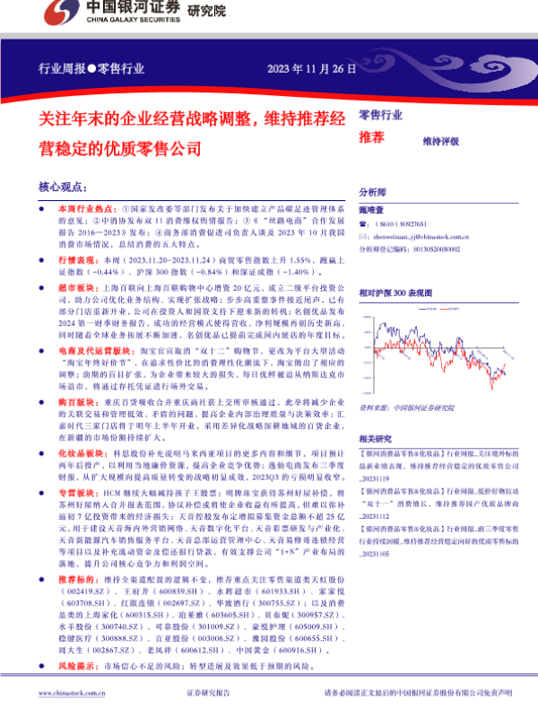 【银河证券】【20231126】零售行业周报:关注年末的企业经营战略调整,维持推荐经营稳定的优质零售公司-33页 行业研究