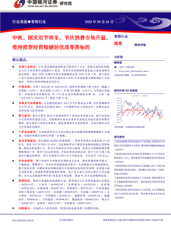 【银河证券】【20230924】零售行业周报:中秋、国庆双节将至,节庆消费市场升温,维持推荐经营稳健的优质零售标的-35页 行业研究