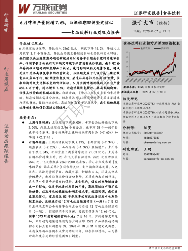 【万联证券】【20200721】20200721-万联证券-食品饮料行业周观点报告:6月啤酒产量同增7.6%,白酒短期回调坚定信心-13页 行业研究