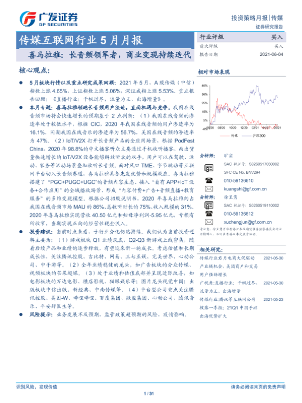 【广发证券】【20210604】20210604-广发证券-传媒互联网行业5月月报:喜马拉雅:长音频领军者,商业变现持续迭代-31页 行业研究