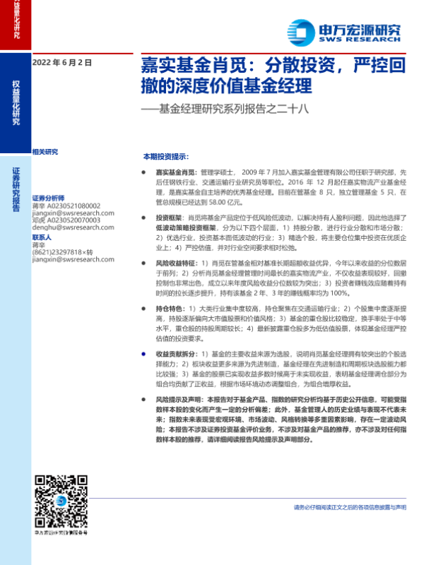 【申万宏源】【20220602】嘉实基金肖觅:分散投资,严控回撤的深度价值基金经理-20页 行业研究