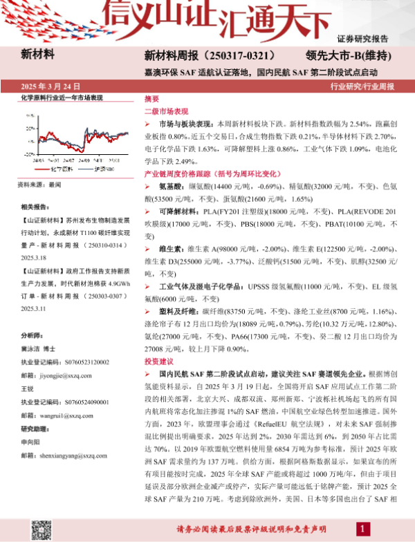 【山西证券】【20250324】2025年03月27日更新-【山西证券】新材料周报:嘉澳环保SAF适航认证落地,国内民航SAF第二阶段试点启动-23页 行业研究