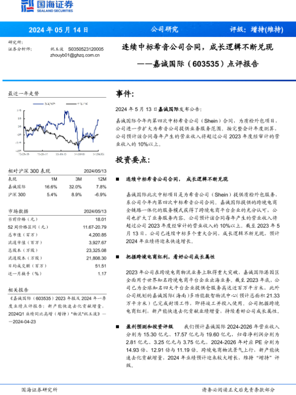 【国海证券】【20240514】连续中标希音公司合同,成长逻辑不断兑现——嘉诚国际(603535)点评报告-5页 行业研究