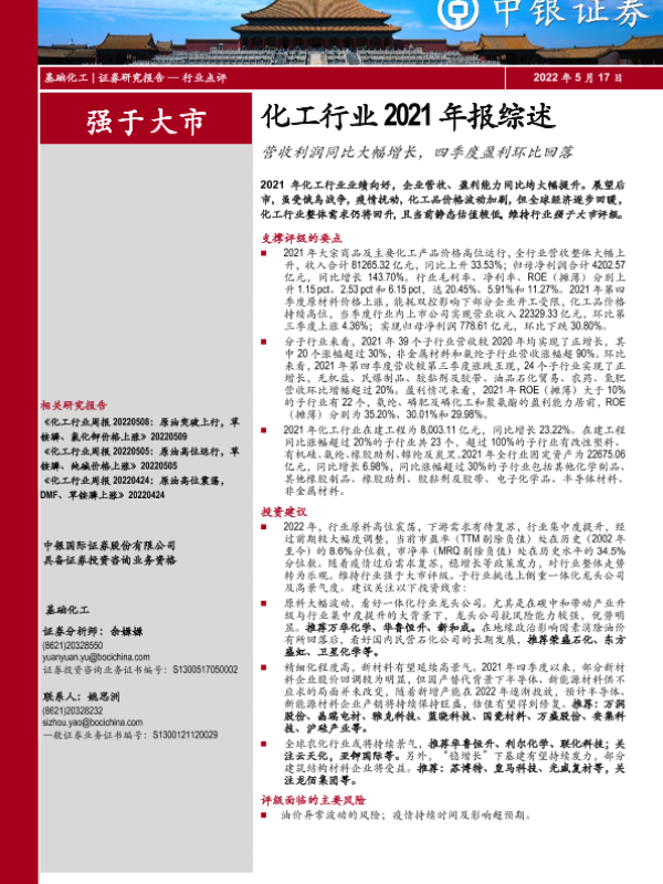【中银证券】【20220517】化工行业2021年报综述:营收利润同比大幅增长,四季度盈利环比回落-23页 行业研究