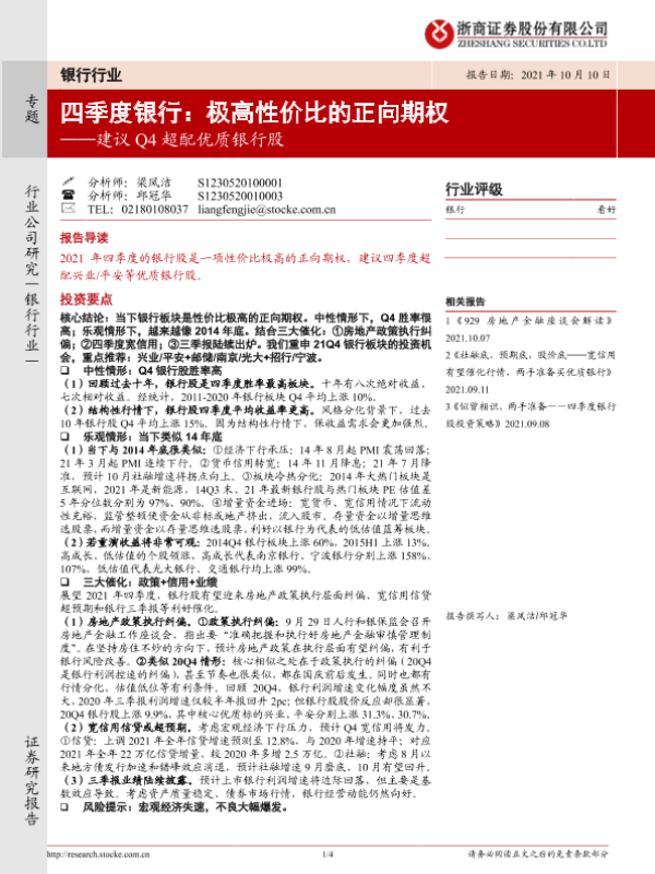 【浙商证券】【20211010】四季度银行:极高性价比的正向期权──建议Q4超配优质银行股-4页 行业研究