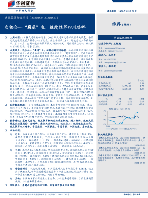 【华创证券】【20210530】建筑装饰行业周报:交铁合一“蜀道”生,继续推荐四川路桥-18页 行业研究